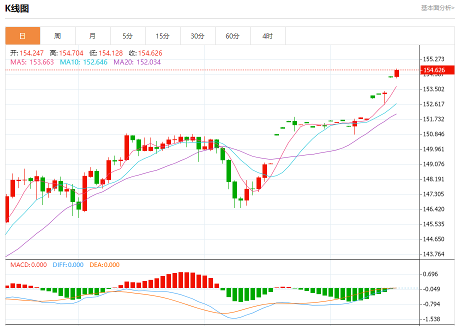 汇价高见154.704,低见154.128。上一交易日,汇价收于154.256。