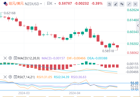 纽元/美元方面,新西兰统计局公布的数据显示,新西兰通胀率持续下降,但仍高于纽储行设定的1%至3%的目标范围。这可能会说服纽储行将高水平利率维持更长时间,从而限制纽元/美元跌幅。