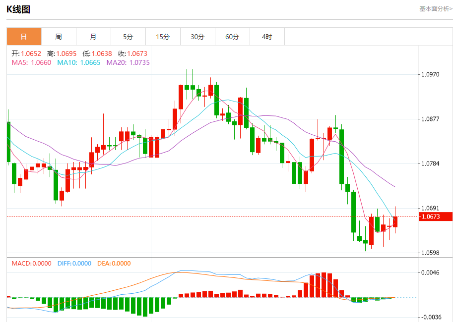 汇价高见1.0695,低见1.0638。上一交易日,汇价收于1.0654。