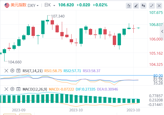 自9月底以来,美元指数一直被困在一个区间内,支撑位在105.50,阻力位在107.20。美元指数在50日、100日和200日移动均线上方交易,而MACD指标则在零轴上方交易。