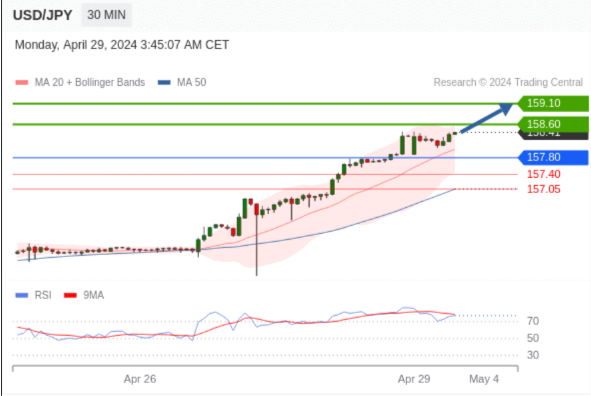 在 157.80 之上,看涨,目标价位为 158.60 ,然后为 159.10 。