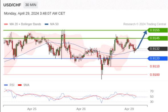 在 0.9120 之上,看涨,目标价位为 0.9145 ,然后为 0.9155 。