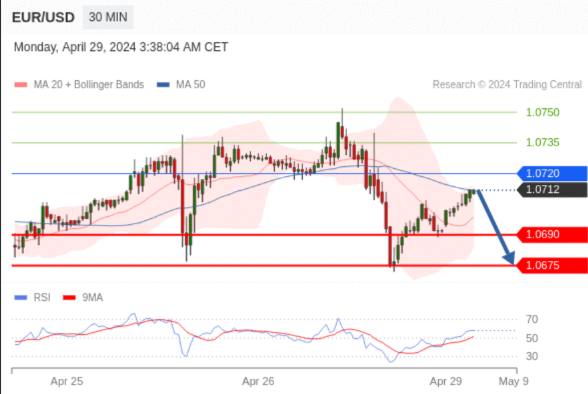 在 1.0720 之下,看跌,目标价位为 1.0690 ,然后为 1.0675 。