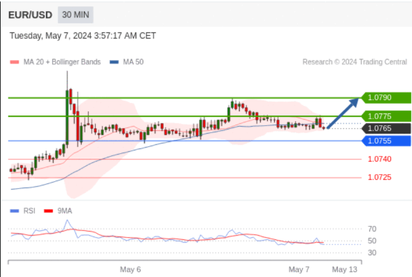 在 1.0755 之上,看涨,目标价位为 1.0775 ,然后为 1.0790 。