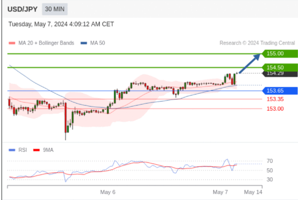 在 153.65 之上,看涨,目标价位为 154.50 ,然后为 155.00 。