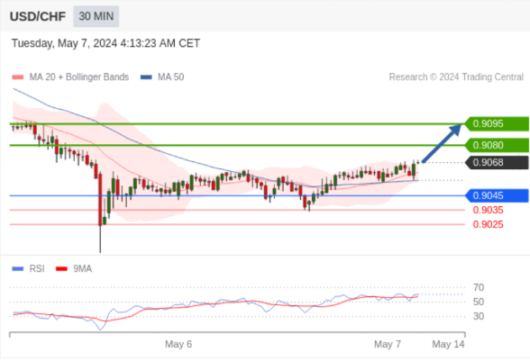 在 0.9045 之上,看涨,目标价位为 0.9080 ,然后为 0.9095 。