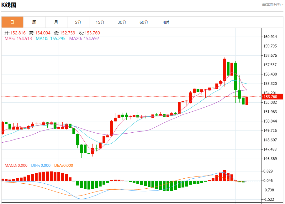 汇价高见153.973,低见152.753。上一交易日,汇价收于152.862。