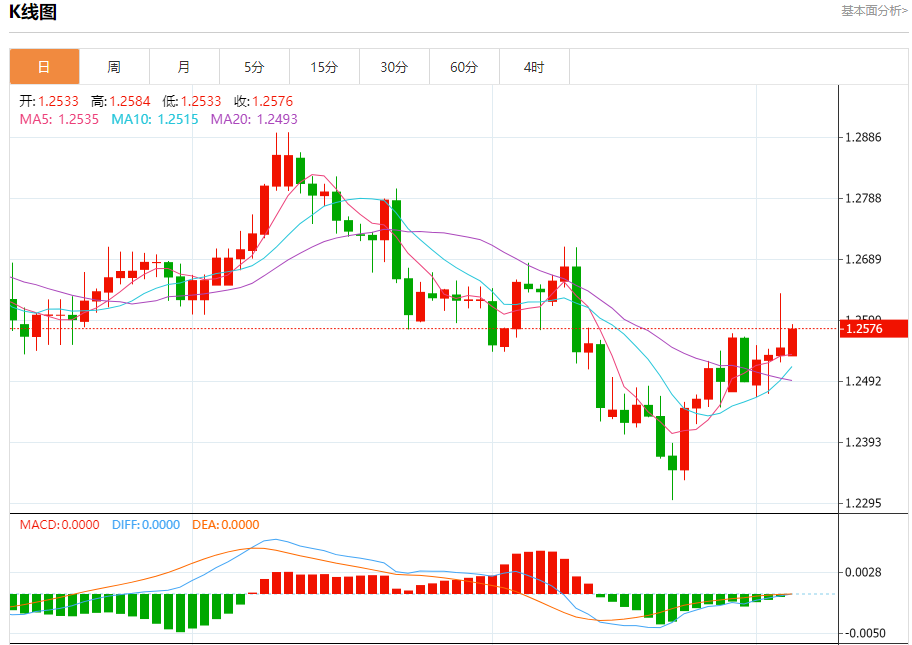 汇价高见1.2584,低见1.2533。上一交易日,汇价收于1.2546。