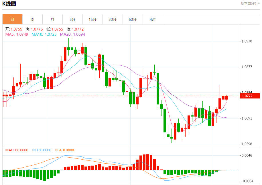 汇价高见1.0776,低见1.0755。上一交易日,汇价收于1.0763。