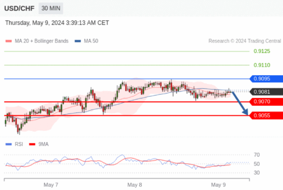 在 0.9095 之下,看跌,目标价位为 0.9070 ,然后为 0.9055 。