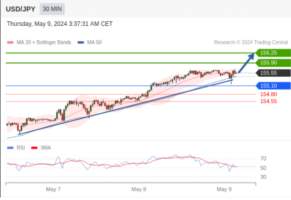 在 155.10 之上,看涨,目标价位为 155.90 ,然后为 156.25 。