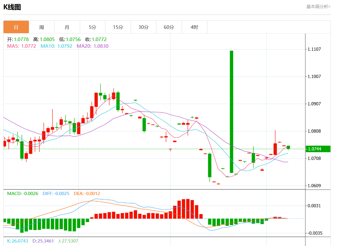 周三欧市盘中,欧元/美元最新报1.0744,日图跌0.09%.