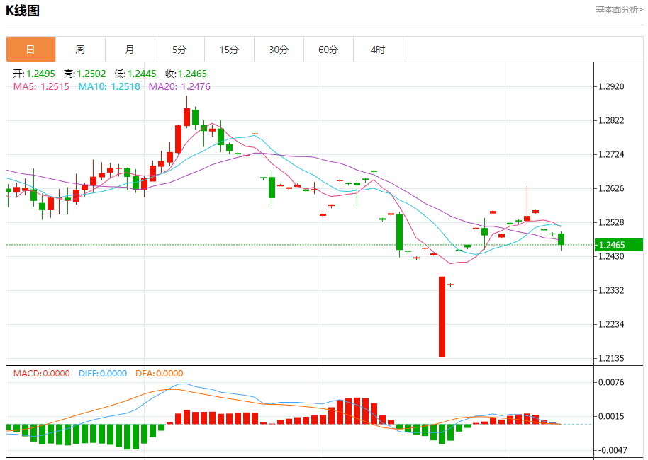 汇价高见1.2502,低见1.2445。上一交易日,汇价收于1.2497。