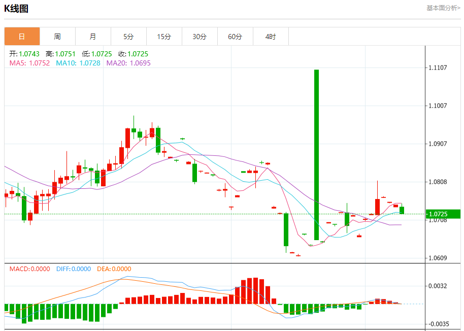 汇价高见1.0751,低见1.0725。上一交易日,汇价收于1.0748。