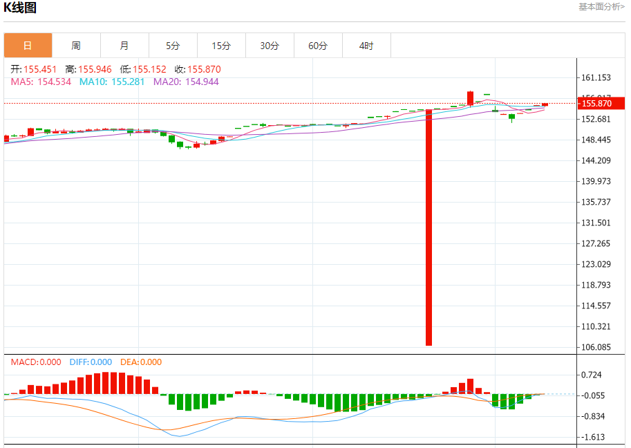 汇价高见155.946,低见155.152。上一交易日,汇价收于155.478。