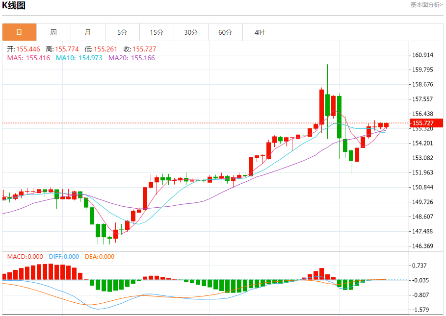汇价高见155.775,低见155.261。上一交易日,汇价收于155.458。