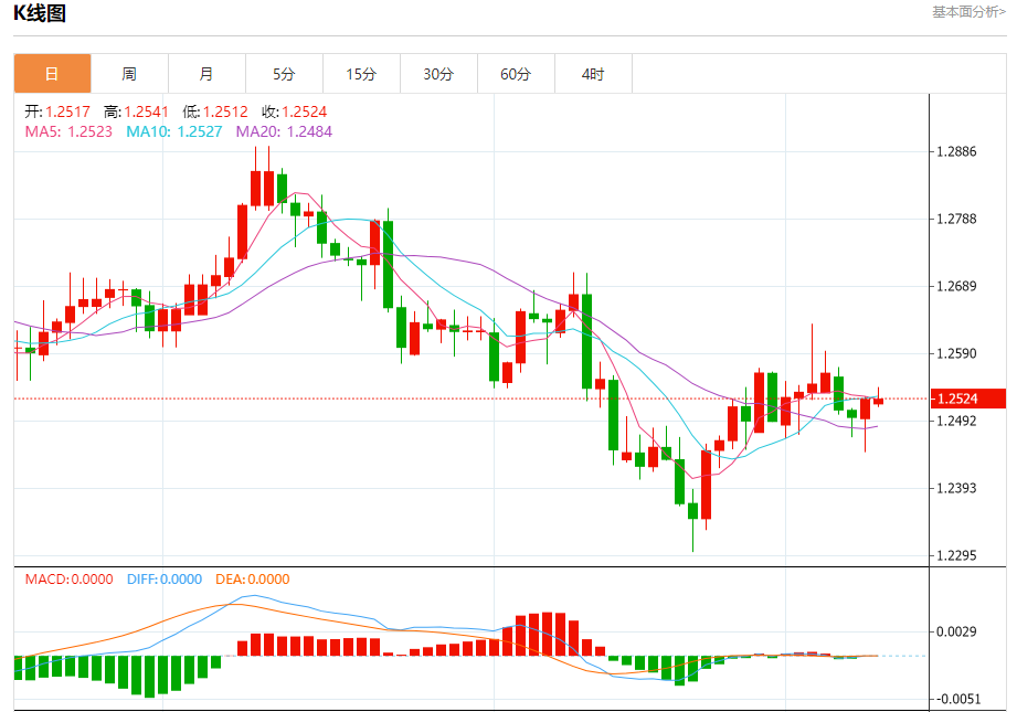 汇价高见1.2541,低见1.2512。上一交易日,汇价收于1.2523。