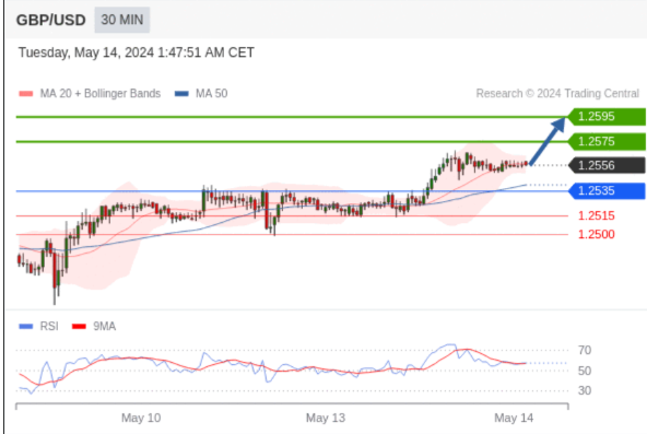 在 1.2535 之上,看涨,目标价位为 1.2575 ,然后为 1.2595 。