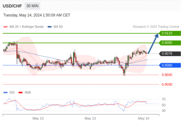 在 0.9060 之上,看涨,目标价位为 0.9095 ,然后为 0.9110 。