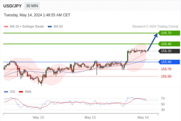 在 155.90 之上,看涨,目标价位为 156.40 ,然后为 156.70 。