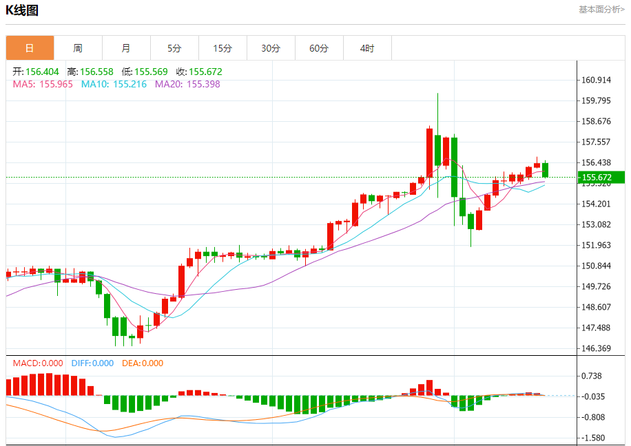 汇价高见156.558,低见155.569。上一交易日,汇价收于156.395。