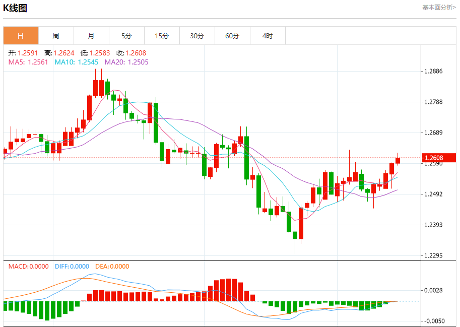 汇价高见1.2624,低见1.2583。上一交易日,汇价收于1.2592。