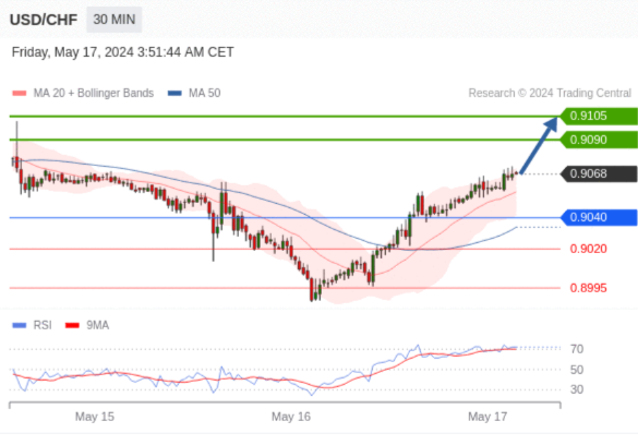 在 0.9040 之上,看涨,目标价位为 0.9090 ,然后为 0.9105 。