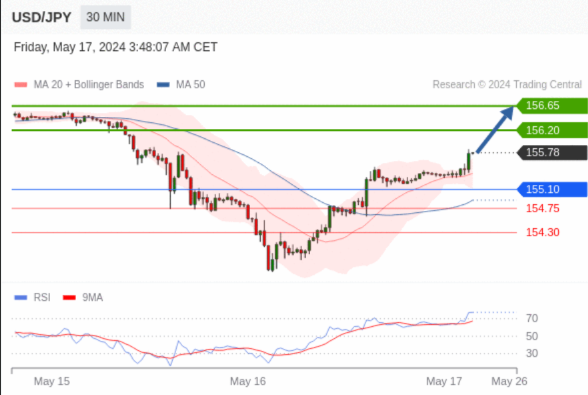 在 155.10 之上,看涨,目标价位为 156.20 ,然后为 156.65 。