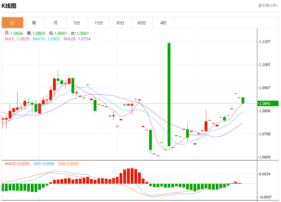 汇价高见1.0869,低见1.0841。上一交易日,汇价收于1.0867。
