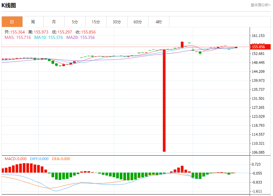 汇价高见155.973,低见155.297。上一交易日,汇价收于155.385。