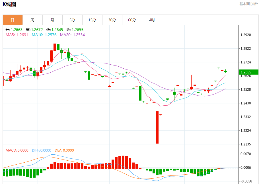 汇价高见1.2672,低见1.2645。上一交易日,汇价收于1.2669。