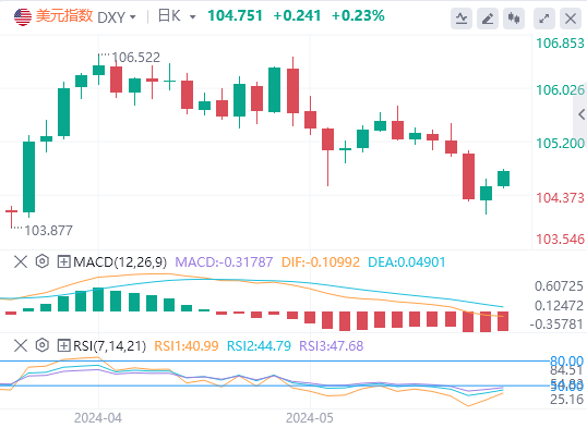 周四,美国4月进口价格升幅远超预期,加之美联储官员发表鹰派言论,美元指数周四反弹。追踪美元兑六种主要货币的ICE美元指数走高0.19%,报104.51。