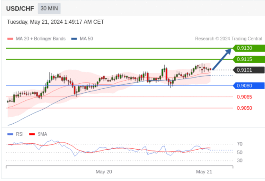 在 0.9080 之上,看涨,目标价位为 0.9115 ,然后为 0.9130 。