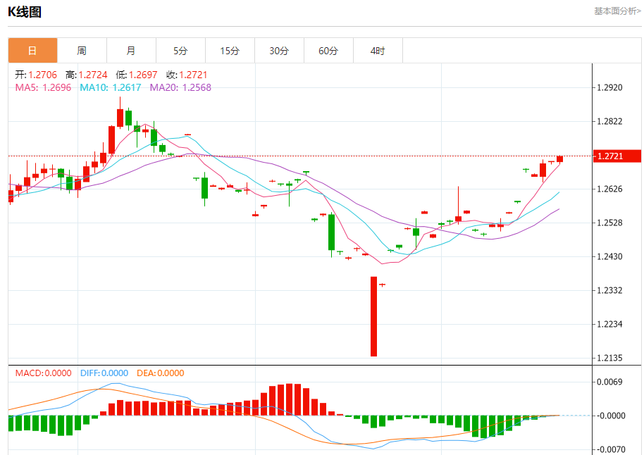 汇价高见1.2724,低见1.2697。上一交易日,汇价收于1.2706。