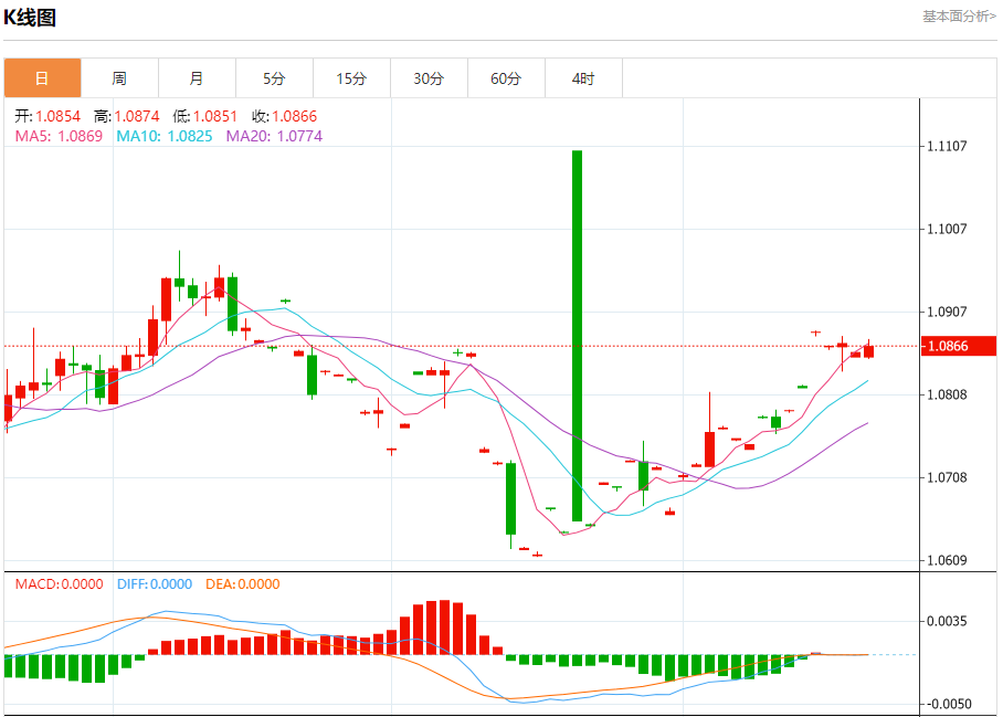 汇价高见1.0874,低见1.0851。上一交易日,汇价收于1.0856。