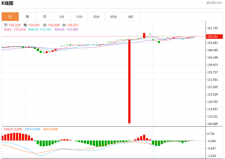 汇价高见156.541,低见156.028。上一交易日,汇价收于156.243。