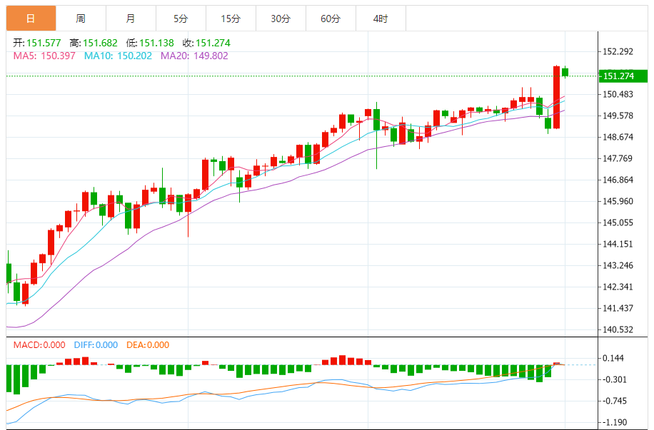 周三(11月1日),美元/日元下跌,暂报151.278,跌幅0.26%。