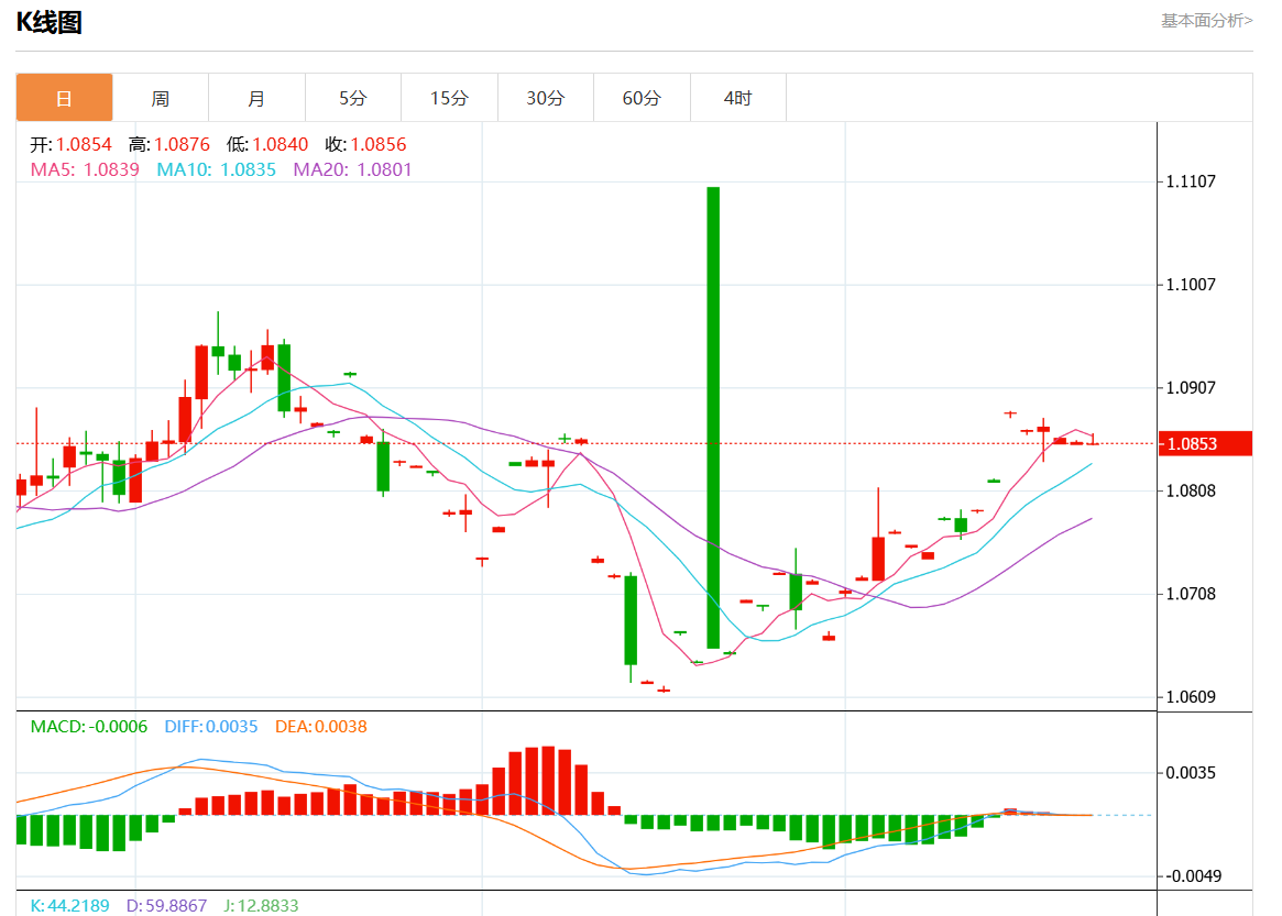 周三欧市盘中,欧元/美元最新报1.0851,日图跌0.03%.