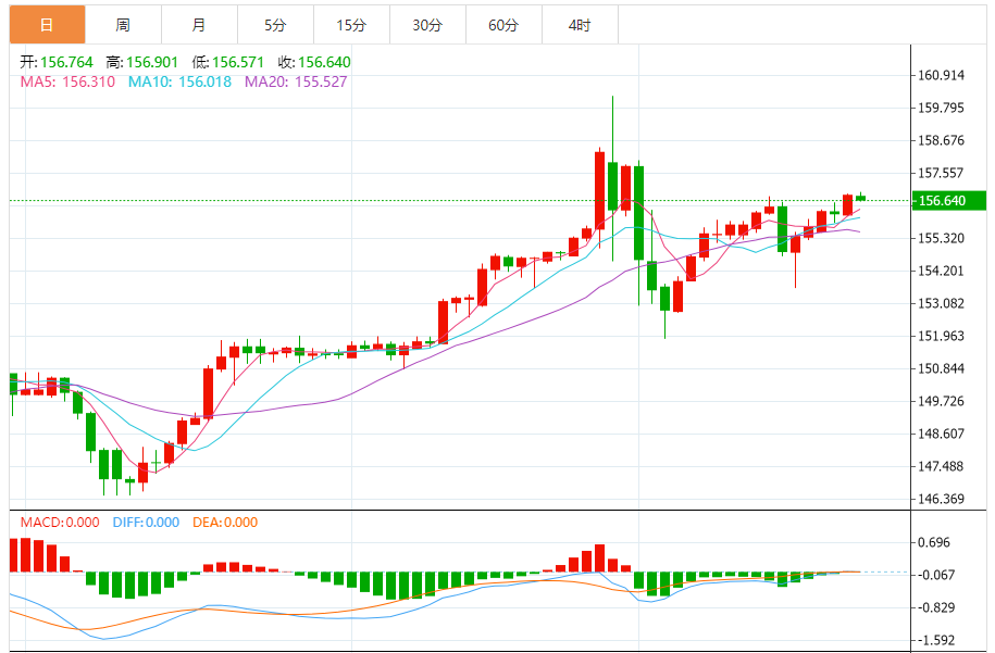 周四(5月23日),美元/日元下跌,暂报156.649,跌幅0.11%。