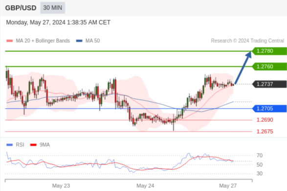 在 1.2705 之上,看涨,目标价位为 1.2760 ,然后为 1.2780 。