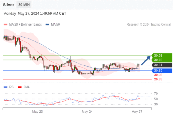 在 30.25 之上,看涨,目标价位为 30.75 ,然后为 30.95 。