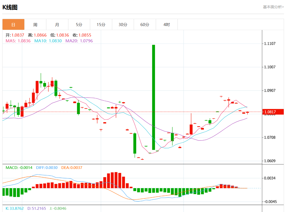 周五欧市盘中,欧元/美元最新报1.0818,日图涨0.03%.