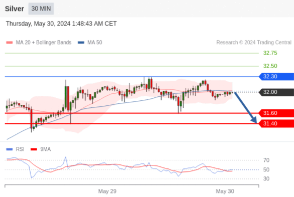 在 32.30 之下,看跌,目标价位为 31.60 ,然后为 31.40 。