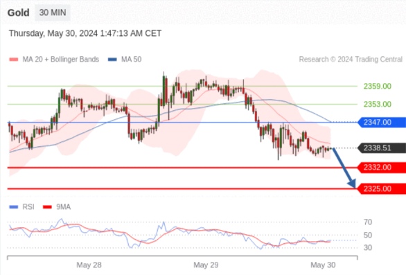 【XM交易平台】2024年5月30日亚盘交易建议:黄金、白银、欧元、英镑、日元、瑞郎交易点位技术分析及预测