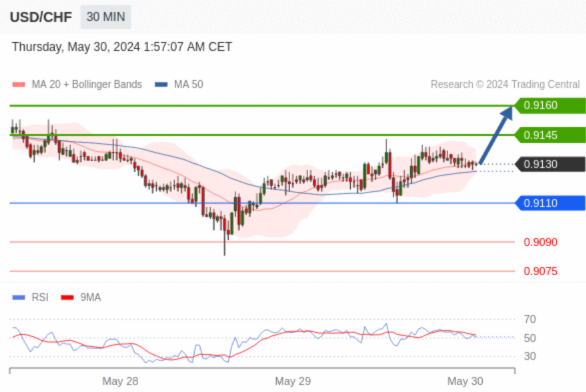 在 0.9110 之上,看涨,目标价位为 0.9145 ,然后为 0.9160 。