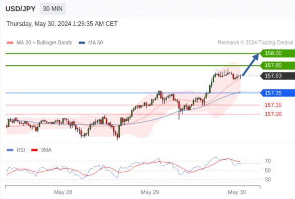 在 157.35 之上,看涨,目标价位为 157.80 ,然后为 158.00 。