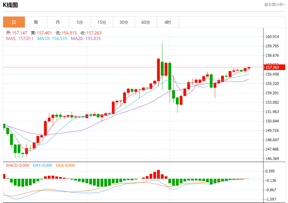 汇价高见157.401,低见156.915。上一交易日,汇价收于157.155。
