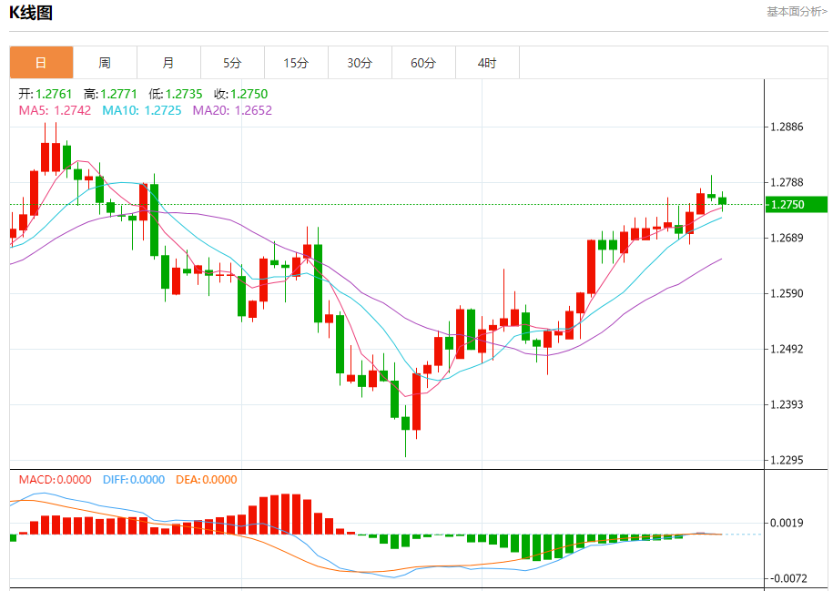 汇价高见1.2771,低见1.2735。上一交易日,汇价收于1.2761。