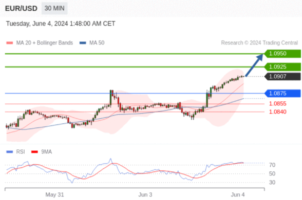 在 1.0875 之上,看涨,目标价位为 1.0925 ,然后为 1.0950 。