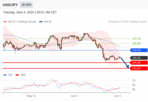 在 156.55 之下,看跌,目标价位为 155.90 ,然后为 155.60 。